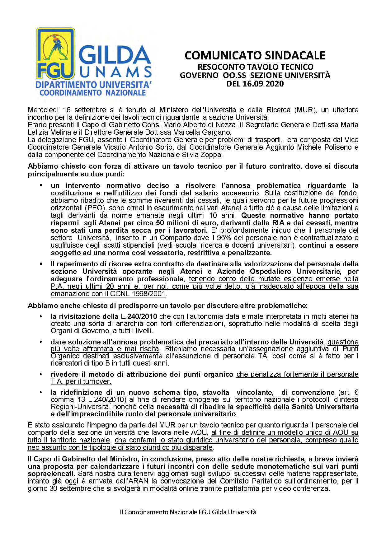 COMUNICATO - RESOCONTO TAVOLO TECNICO GOVERNO OO.SS SEZIONE UNIVERSITÀ DEL 16.09 2020