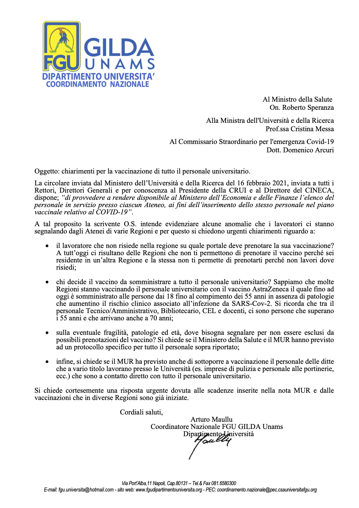 Nota alle Istituzioni: Richiesta chiarimenti per la vaccinazione di tutto il personale universitario