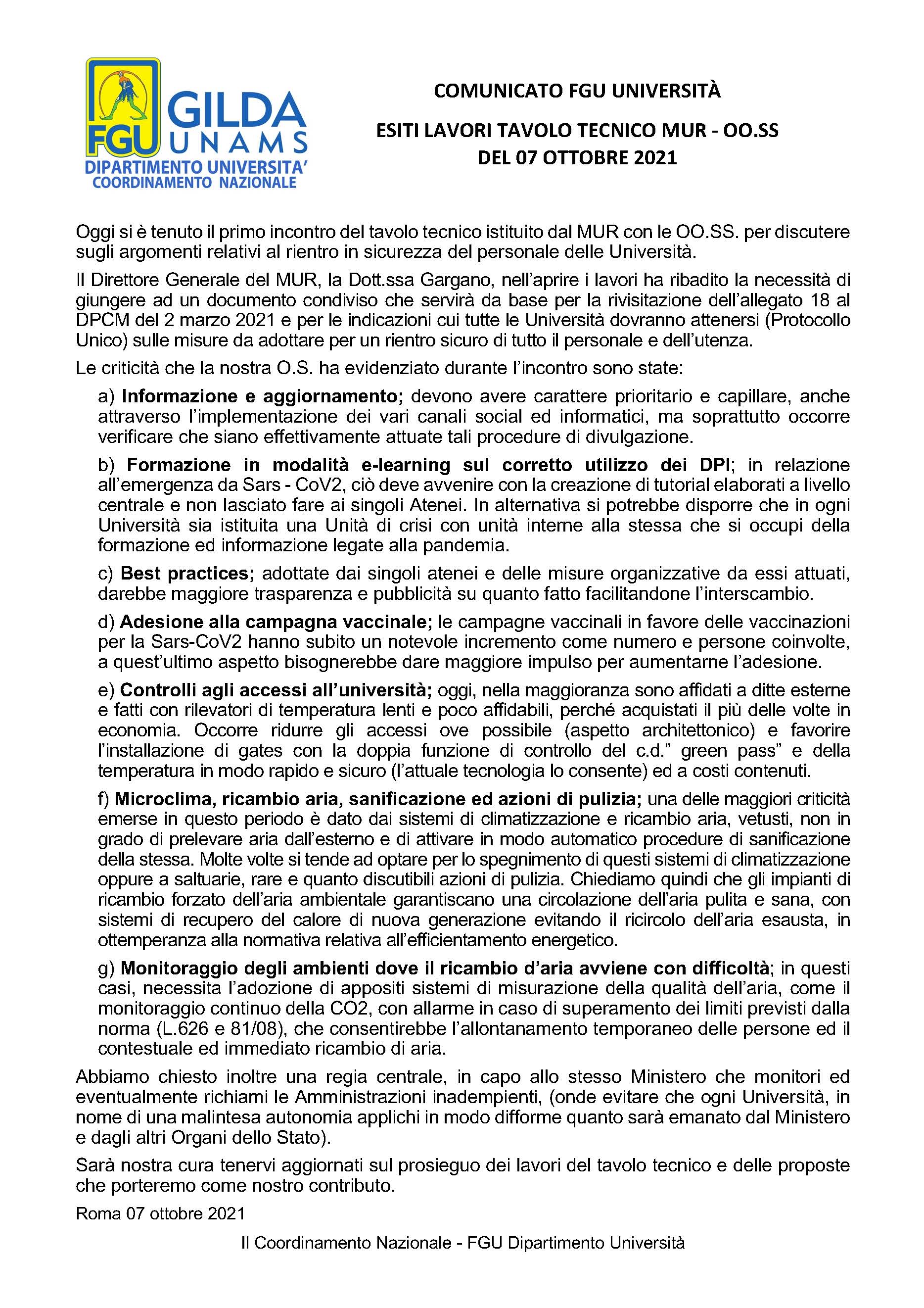 COMUNICATO FGU UNIVERSITÀ : ESITI LAVORI 1° TAVOLO TECNICO MUR - OO.SS. DEL 07 OTTOBRE 2021 " RIENTRO IN SICUREZZA DEL PERSONALE"