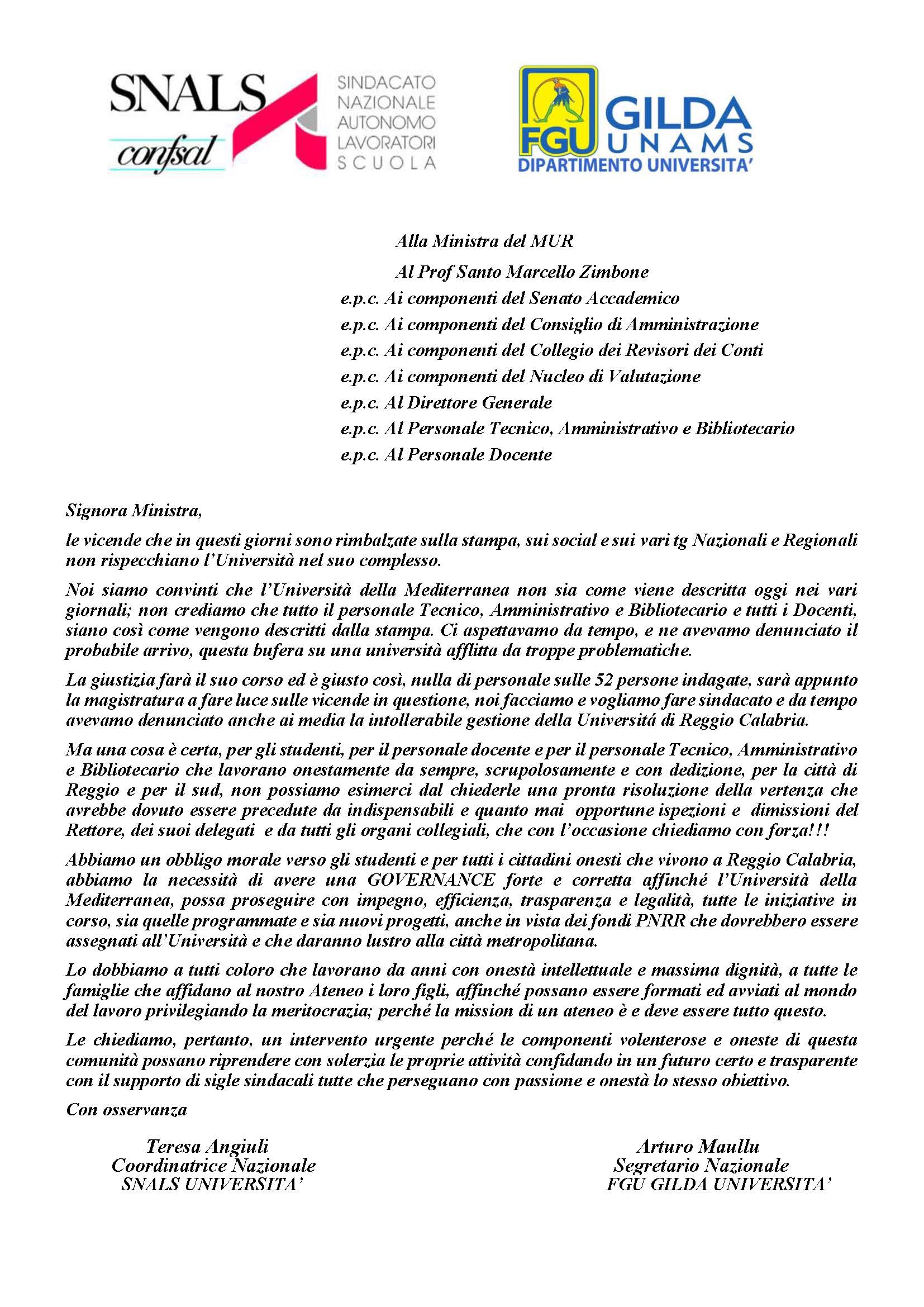 Nota inviata alla Ministra del MUR dallo SNALS e dalla scrivente OS, riguardo alle vicende che in questi giorni sono rimbalzate sulla stampa, sui social e sui vari tg Nazionali e Regionali riferite alll’Università della Mediterranea