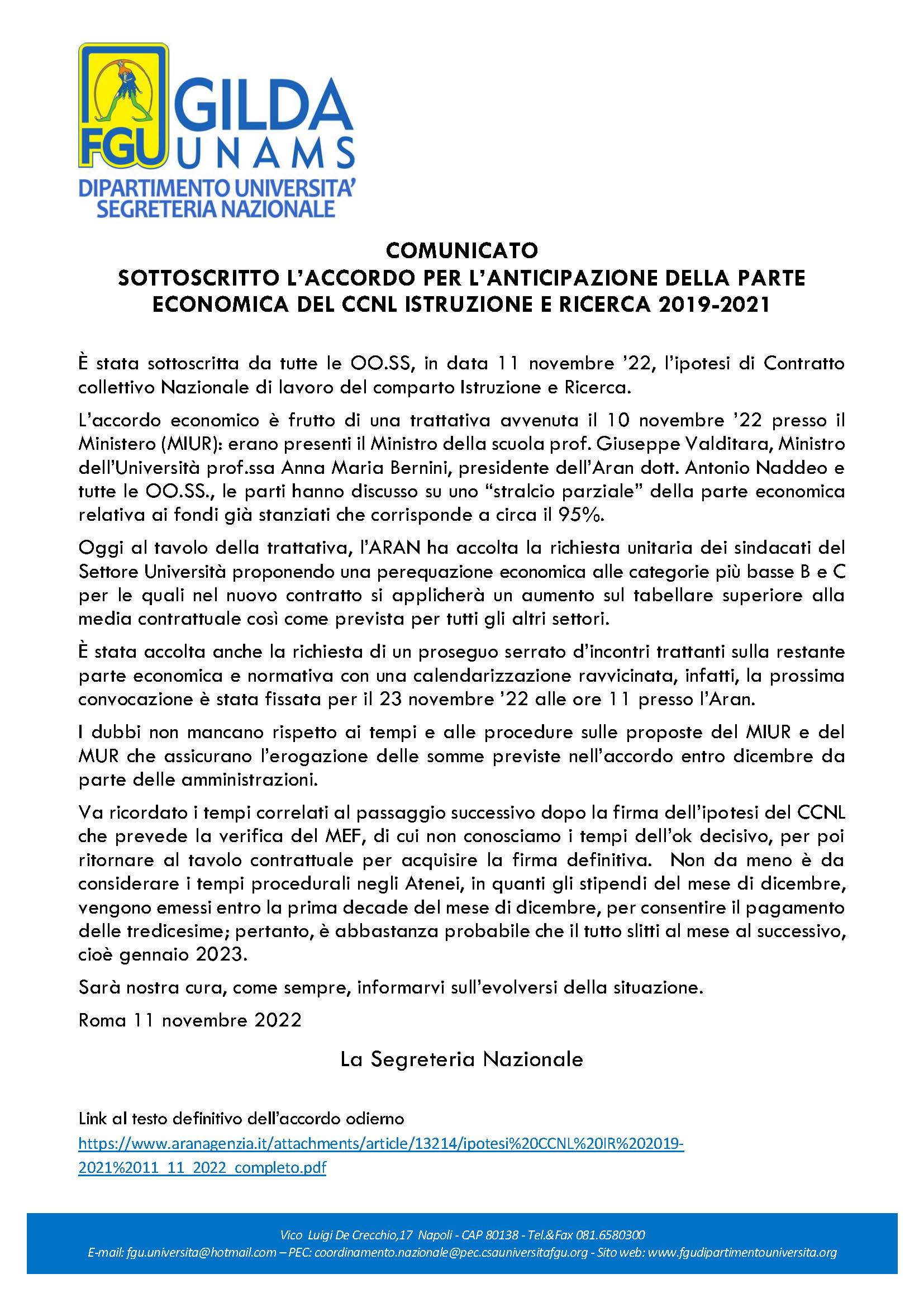 COMUNICATO: SOTTOSCRITTO L’ACCORDO PER L’ANTICIPAZIONE DELLA PARTE ECONOMICA DEL CCNL ISTRUZIONE E RICERCA 2019-2021