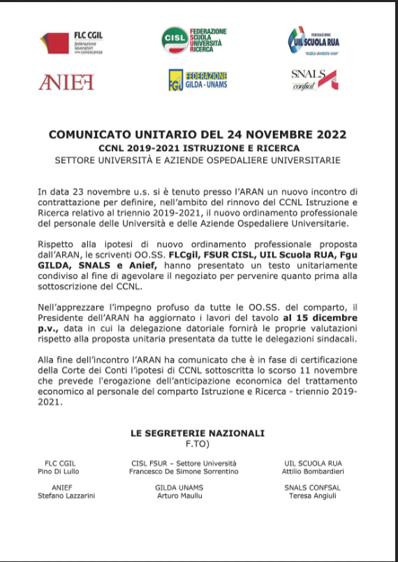 COMUNICATO UNITARIO DEL 24 NOVEMBRE 2022 CCNL 2019-2021 ISTRUZIONE E RICERCA SETTORE UNIVERSITÀ E AZIENDE OSPEDALIERE UNIVERSITARIE