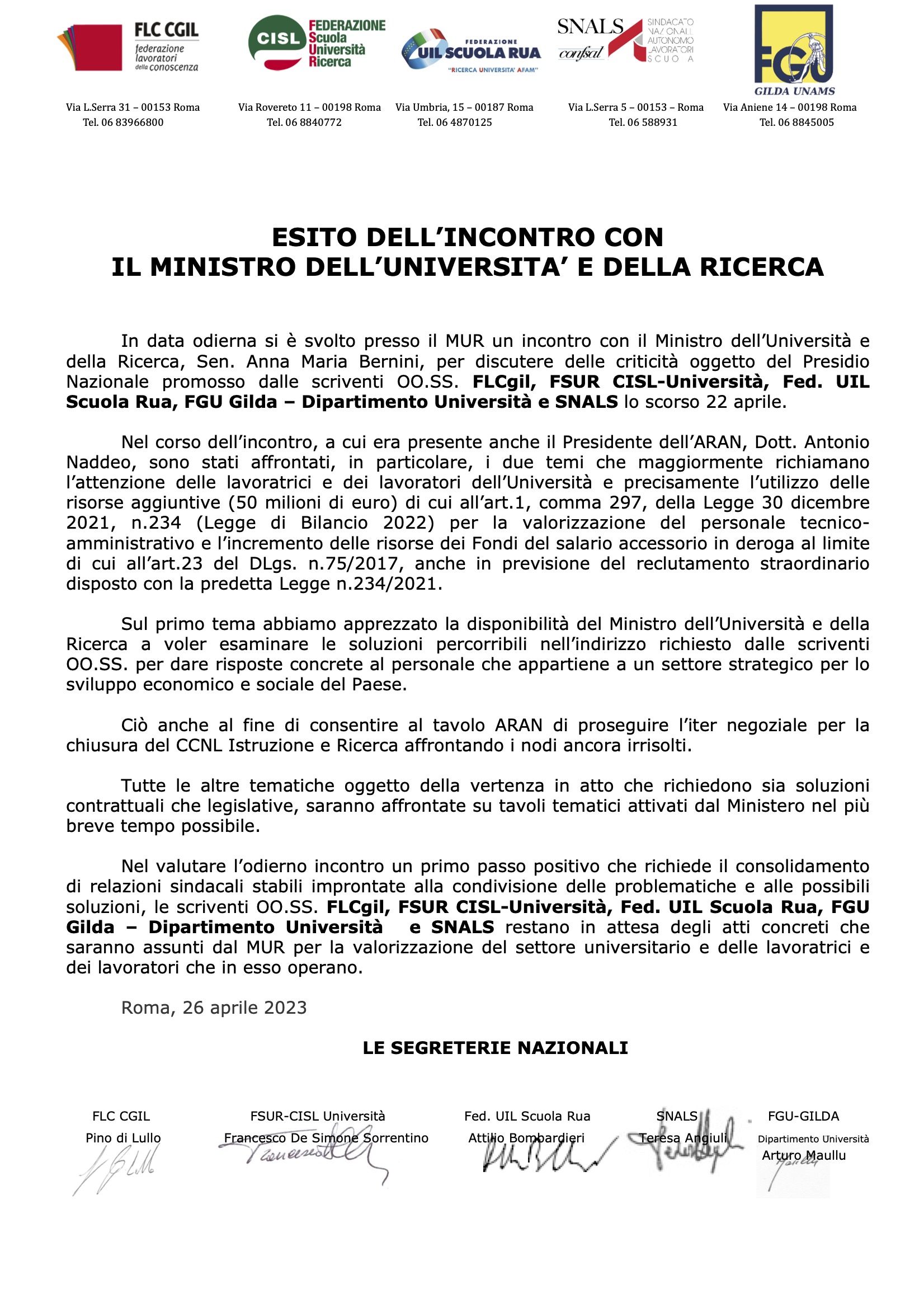 COMUNICATO UNITARIO DEL 26 APRILE 2023: RESOCONTO DELL'INCONTRO AL MUR CON LA MINISTRA BERNINI