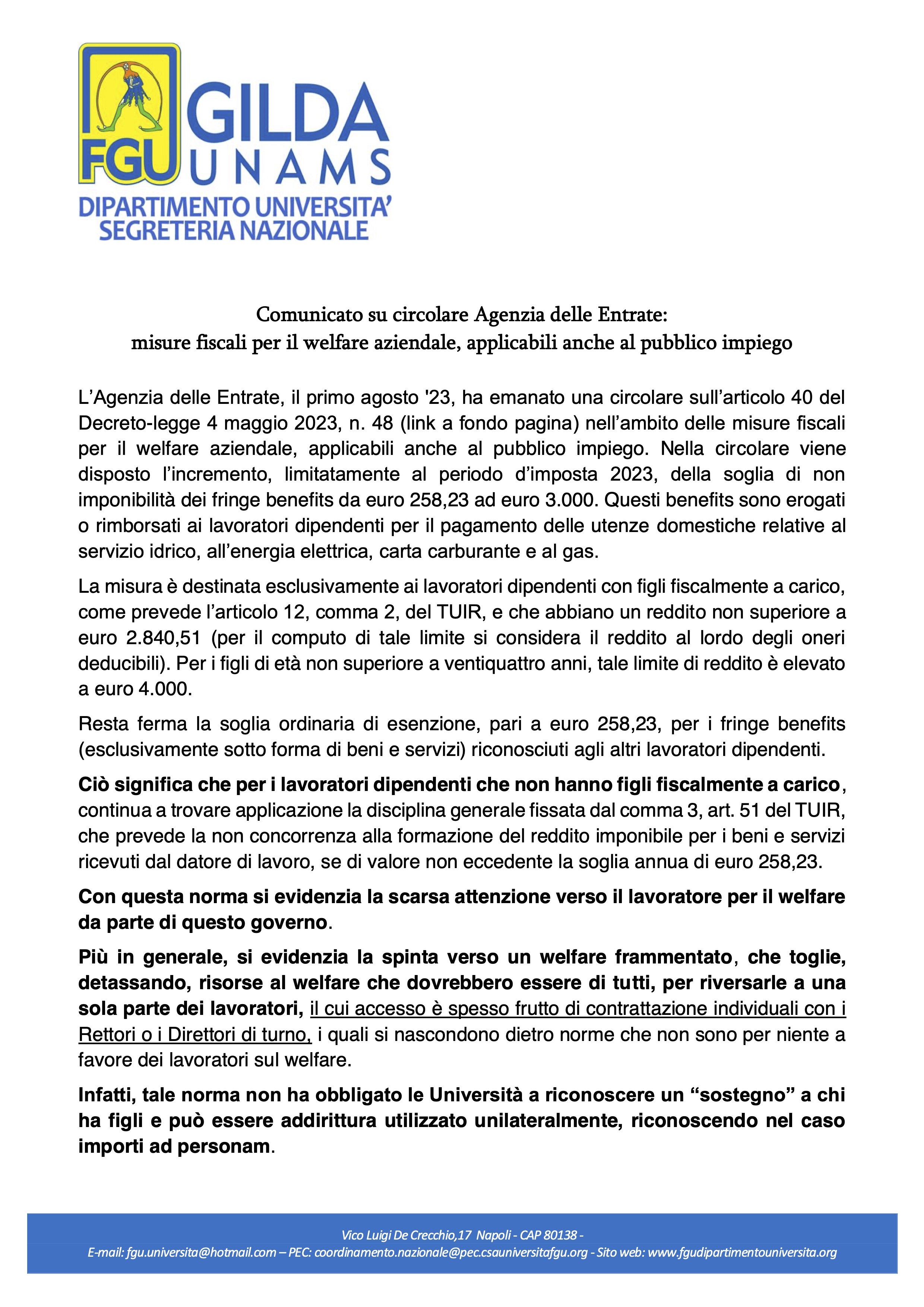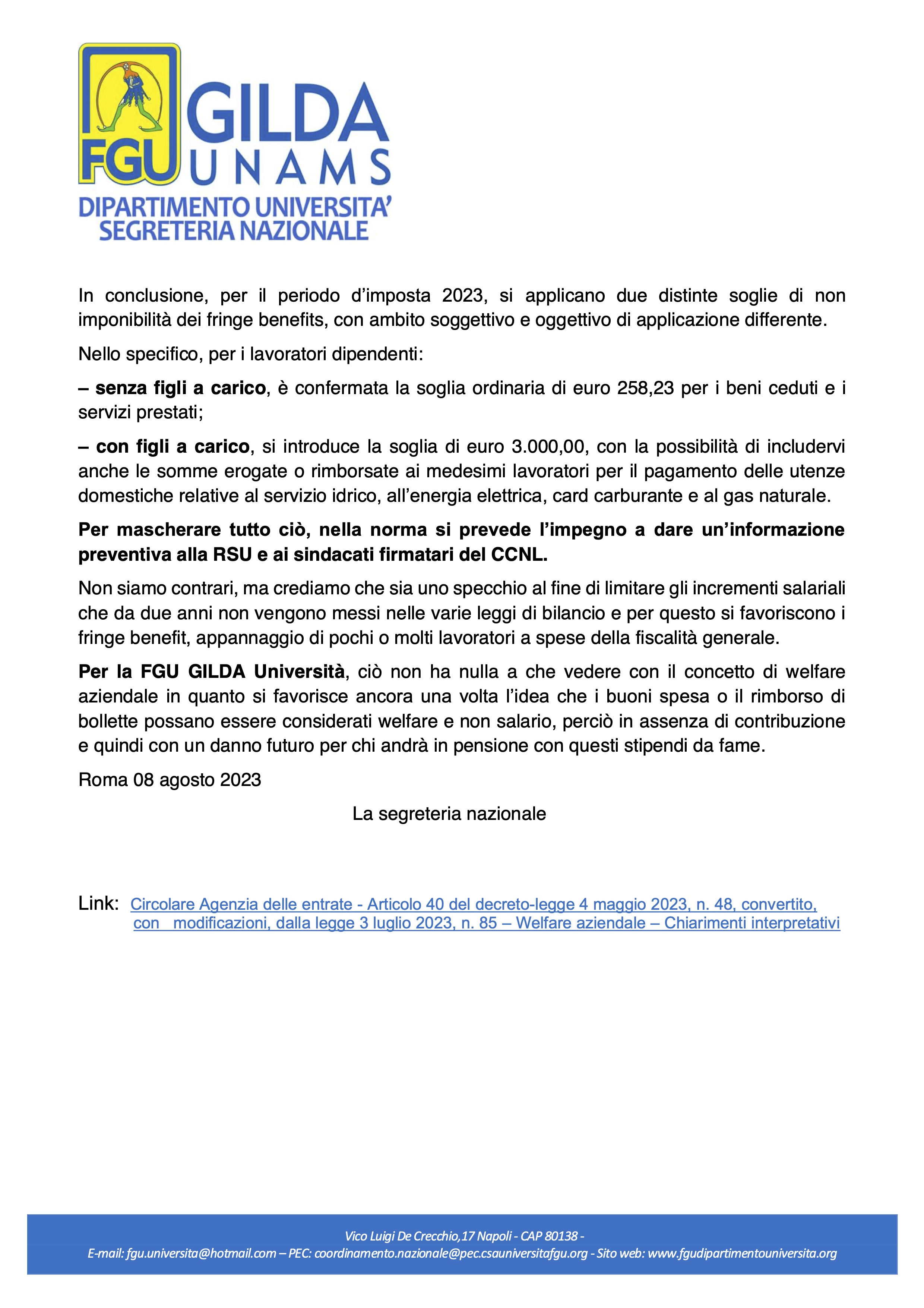 Comunicato su circolare Agenzia delle Entrate: misure fiscali per il welfare aziendale, applicabili anche al pubblico impiego