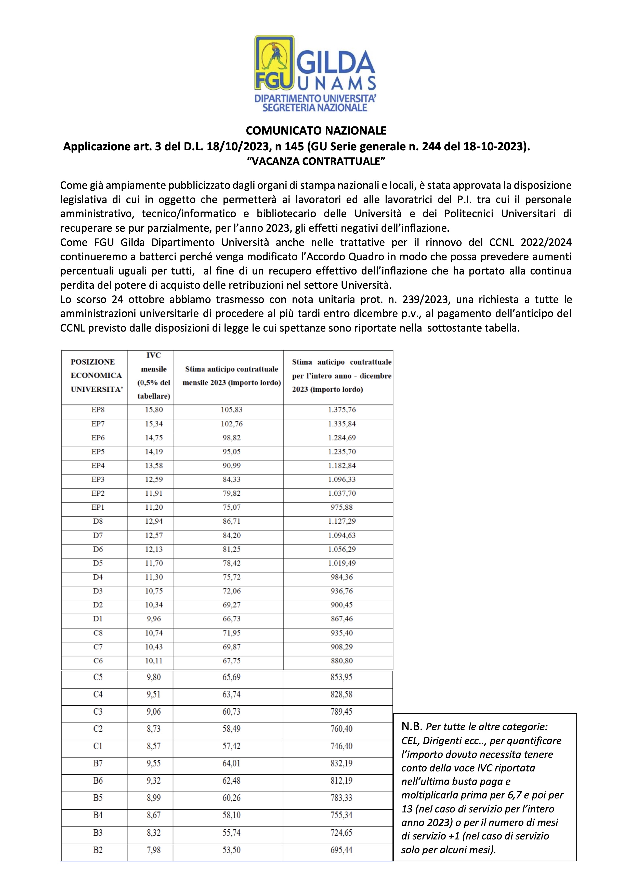 Comunicato:Applicazione art.3 D.L. n.145 del 18/10/2023“VACANZA CONTRATTUALE”