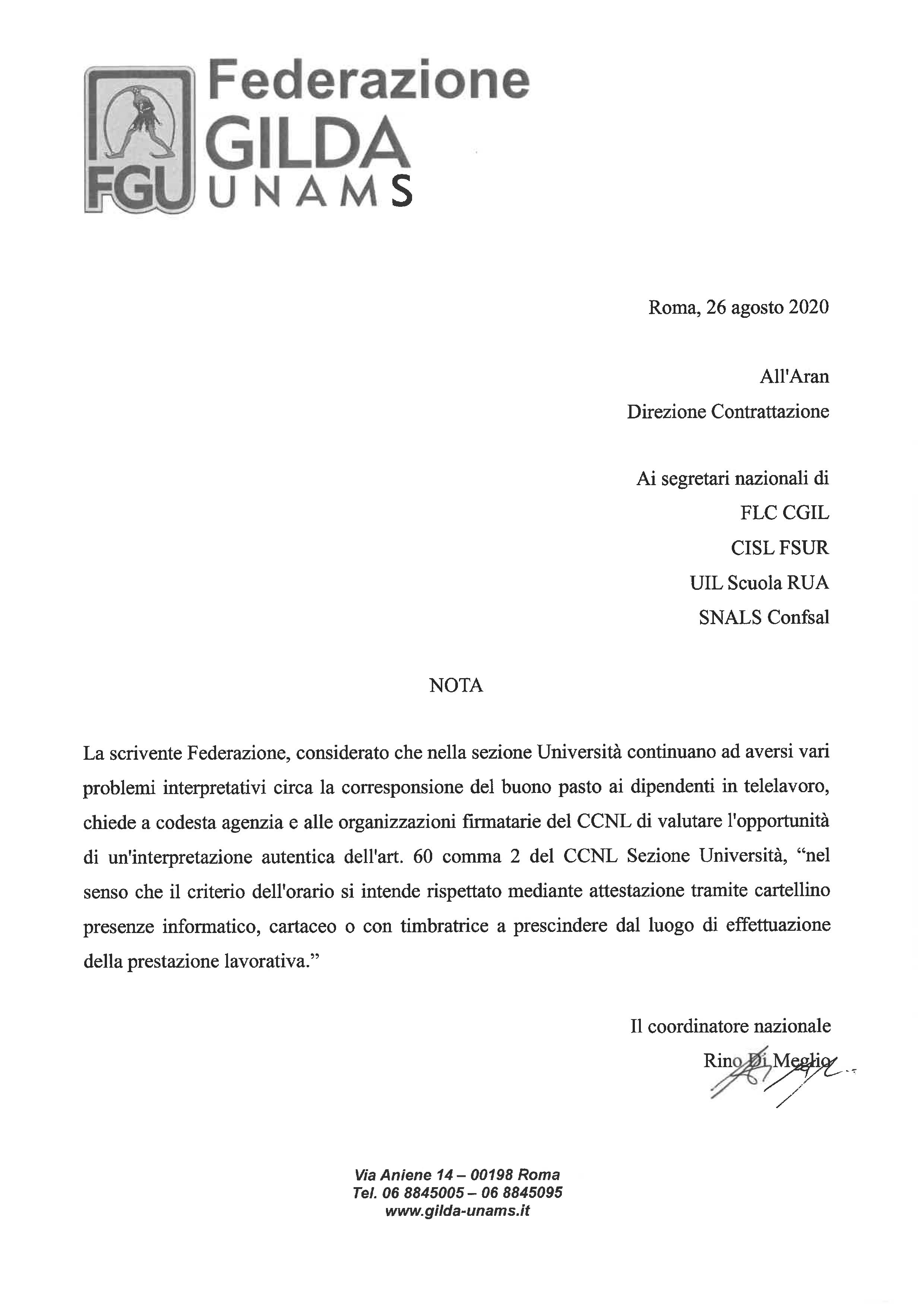 Richiesta FGU all'ARAN ''interpretazione autentica riguardo alle problematiche interpretative della corresponsione dei buoni pasto dipendenti in SW''