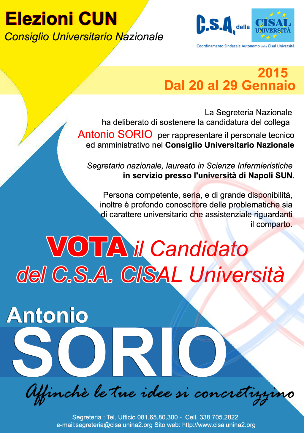 La Segreteria Nazionale ha deliberato di sostenere la candidatura del collega Antonio SORIO per rappresentare il personale tecnico-amministrativo nel Consiglio Universitario Nazionale (CUN).