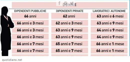 Un decreto sulle attese di vita appesantisce la riforma Fornero. Nessuna variazione l'anno prossimo, poi verranno penalizzate soprattutto le lavoratrici autonome e del privato. Fonte Quotidiano.net - ETÀ anagrafica per la pensione di vecchiaia e anni di contribuzione per quella anticipata saranno aumentati di quattro mesi dal primo gennaio 2016. È questo l’effetto del collegamento, previsto dalla riforma, tra incremento dell’aspettativa di vita, come calcolata dall’Istat, e requisiti pensionistici. A certificarlo è un decreto Economia-Lavoro, firmato il 16 dicembre ma ancora tenuto riservato, in attesa della pubblicazione sulla Gazzetta Ufficiale.