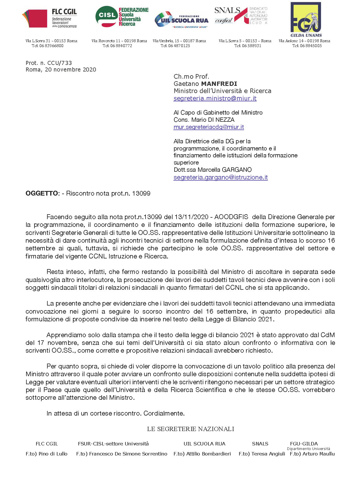 NOTA UNITARIA inviata al Ministro del MUR '' sui temi dell'Università il confronto con le OO.SS. rappresentative e firmatarie del vigente CCNL di settore''