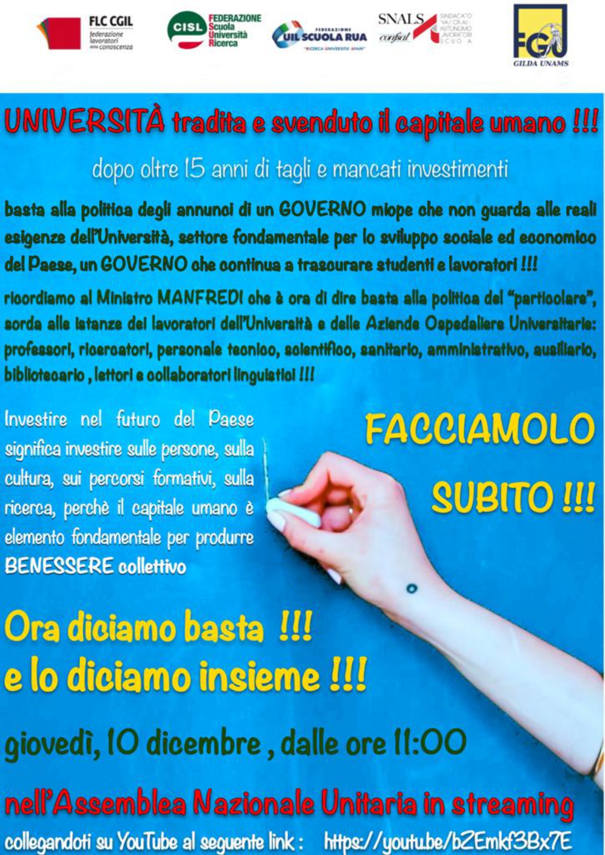 Locandina Unitaria: Indetta L'Assemblea Nazionale del personale delle Università, AOUP e Politecnici giovedi 10.12. 2020 in streaming
