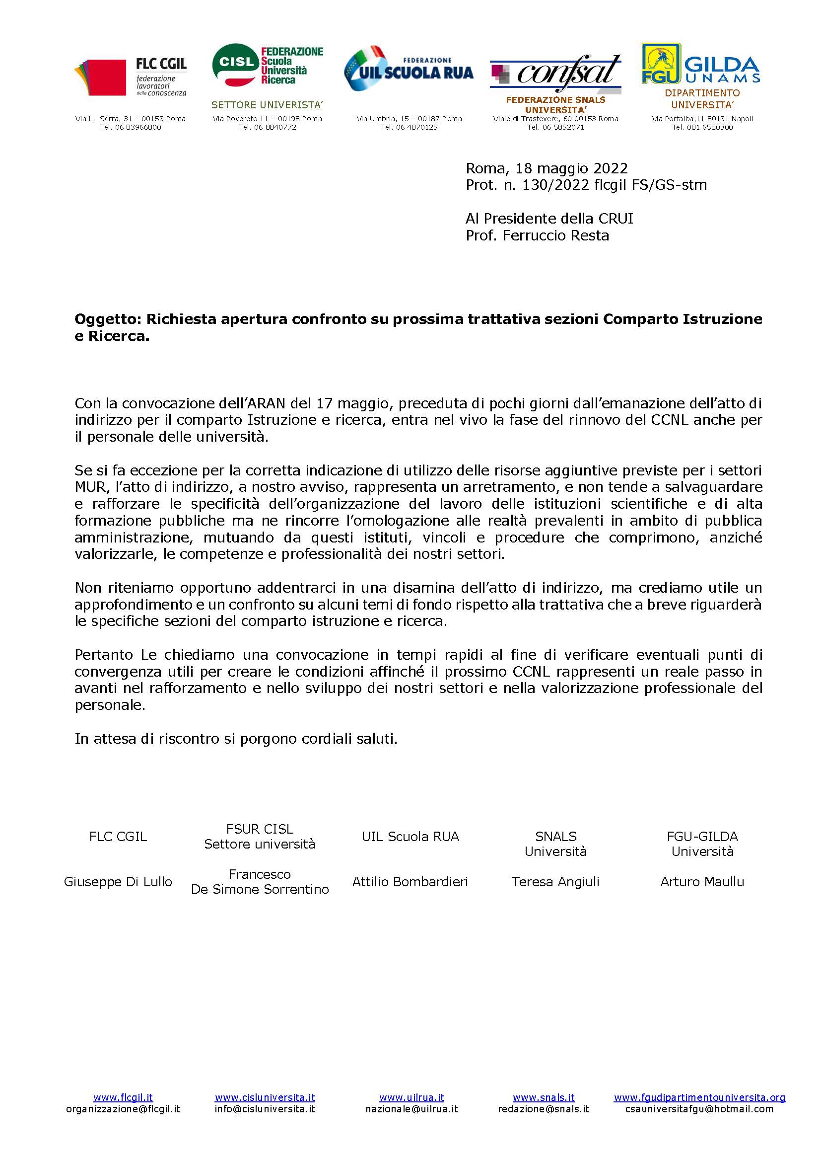 COMUNICATO SINDACALE UNITARIO:Richiesta incontro alla CRUI